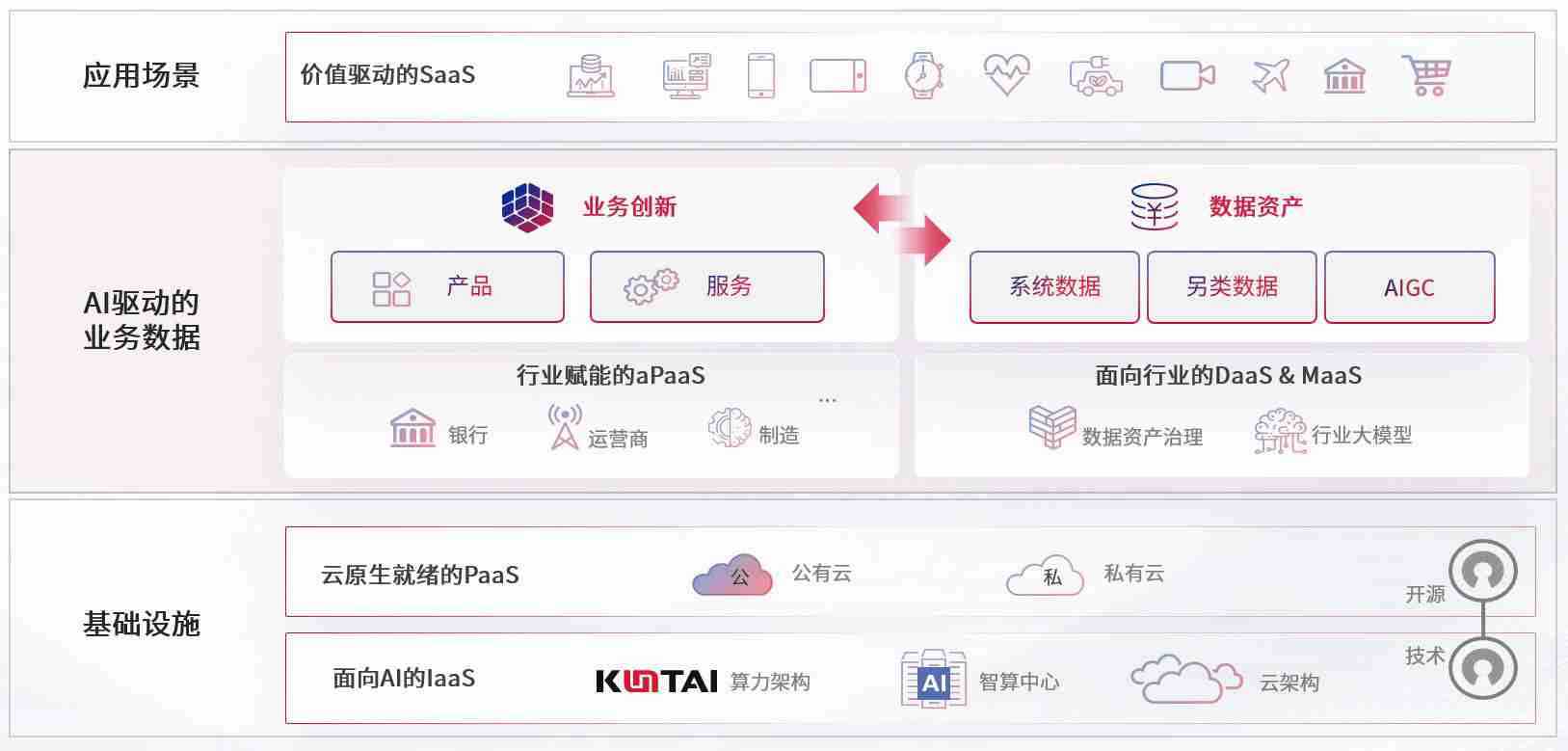 数字时代,,,围绕企业数字化转型的关键要素,,,尊龙旗舰厅数码开创性的提出数云融合战略和技术体系框架,,,,着力在云原生、、、数字原生、、、AI原生和信创产业上架构产品和服务能力,,,,为处在不同数字化转型阶段的快消零售、、、、汽车、、、、金融、、、医疗、、、、政企、、、教育、、、运营商等行业客户提供泛在的敏捷IT能力和融合的数据驱动能力,,构建跨界融合创新的数字业务场景和新业务模式,,,助力企业级客户建立面向未来的核心能力和竞争优势,,,,全面推动社会的数字化、、、智能化转型升级。。。